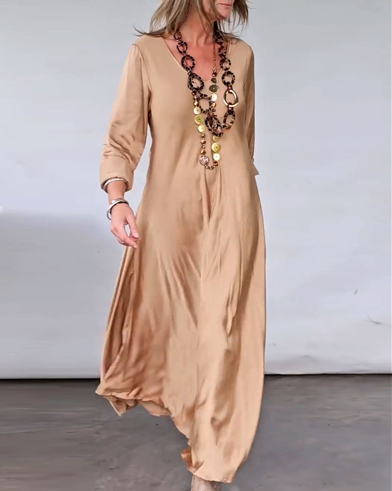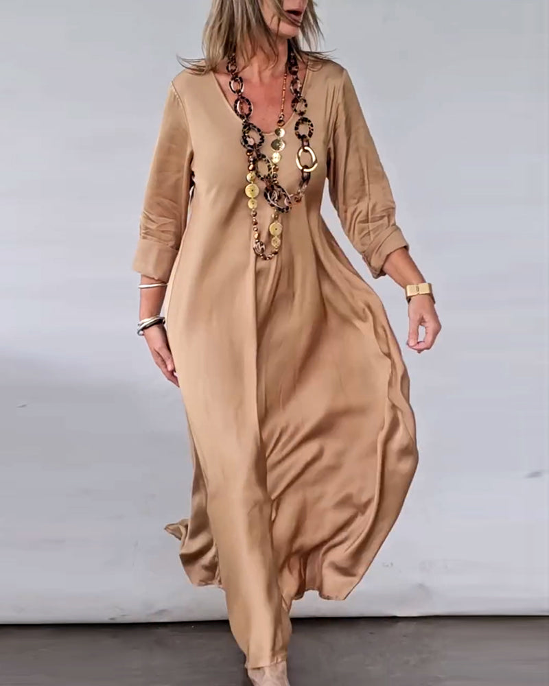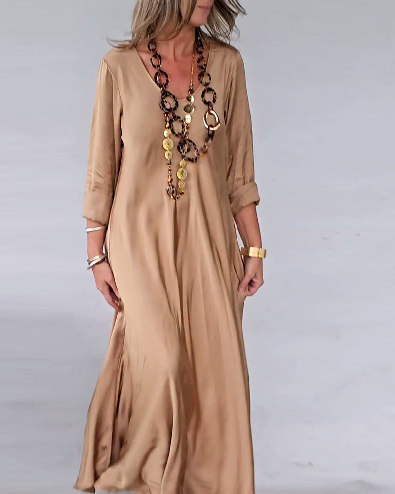 Prosta jednokolorowa elegancka sukienka z długim rękawem i kieszeniami