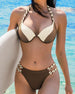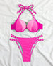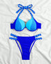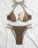 SPECYFIKACJA: Styl: Urlop Materiał: 15% Spandex,85% Poliester Okazja: Wakacje Dekolt: Halter Wzór: Wielokolorowa Długość rękawa: Bez rękawów Rodzaj koszulki: Bikini Rodzaj biustonosza: Biustonosz nieusztywniany, biustonosz miękki Rodzaj dołu: Stringi Typ sylwetki: Szczupły Pora roku: Lato Detale: Z odkrytymi plecami, Sznurowane Paczka zawier...