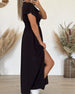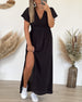 SPECYFIKACJA: Styl: Elegancki Materiał: 100% Bawełna Rodzaj Sukienki: Trapezowa Długość Sukienki: Maxi Dekolt: W serek Wzór: Jednolity Kolor Rodzaj rękawa: Rękaw standardowy Długość rękawa: Krótki rękaw Detale: Rozcięcie Typ sylwetki: Regularny Pora roku: Wiosna, Lato, Jesień Okazja: Na co dzień Paczka zawiera: 1 x Sukienka TABELA ROZMIARÓ...