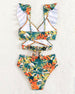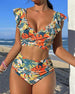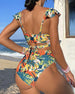 SPECYFIKACJA: Styl: Urlop Materiał: 15% Spandex, 85% Poliester Okazja: Wakacje Dekolt: W serek Wzór: Wzór w liście Długość rękawa: Bez rękawów Rodzaj koszulki: Bikini Rodzaj biustonosza: Biustonosz nieusztywniany, biustonosz miękki Rodzaj dołu: Wysokie wcięcie Typ sylwetki: Szczupły Pora roku: Lato Detale: Z odkrytymi plecami, Falbanka Paczka...