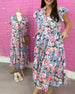 Elegancka długa sukienka z bufiastymi rękawami i nadrukiem