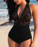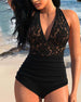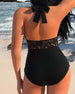 Jednoczęściowy kostium kąpielowy z dekoltem wiązanym na szyi i koronkowymi zakładkami