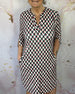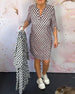 SPECYFIKACJA: Styl: Elegancki, Biznesowy Materiał: Bawełna z domieszką Rodzaj Sukienki: Prosty Długość Sukienki: Do kolan Dekolt: W serek Wzór: Nadruk/Wzór Rodzaj rękawa: Rękawy z rozcięciem Długość rękawa: Rękaw 3/4 Typ sylwetki: Regularny Pora roku: Wiosna, Lato, Jesień Okazja: Na co dzień, Praca Paczka zawiera: 1 x Sukienka TABELA ROZMI...