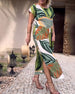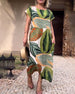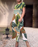 SPECYFIKACJA: Styl: Nieformalny Materiał: 97% Poliester, 3% Spandex Rodzaj Sukienki: Trapezowa Długość Sukienki: Maxi Dekolt: Okrągły dekolt Wzór: Wzór w liście Rodzaj rękawa: Rękaw standardowy Długość rękawa: Krótki rękaw Detale: Guziki, Rozcięcie Typ sylwetki: Regularny Pora roku: Wiosna, Lato, Jesień Okazja: Na co dzień Paczka zawiera: 1 x...