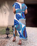 Modna sukienka midi z nadrukiem i okrągłym dekoltem