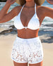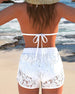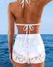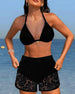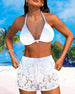SPECYFIKACJA: Styl: Urlop, Elegancki Materiał: 15% Spandex,85% Poliester Okazja: Wakacje Dekolt: Halter Wzór: Jednolity Kolor Długość rękawa: Bez rękawów Rodzaj koszulki: Bikini Rodzaj biustonosza: Biustonosz nieusztywniany, biustonosz miękki Rodzaj dołu: Szorty Typ sylwetki: Szczupły Pora roku: Lato Detale: Patchwork, Sznurowane, Troczek Pa...