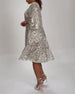Elegancka sukienka z dekoltem w kształcie litery V rękawami typu lampion i geometrycznym nadrukiem