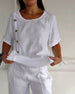 SPECYFIKACJA: Rodzaj Bluzki: Bluzka Styl: Nieformalny Materiał: Bawełna i len Okazja: Na co dzień, Wakacje Dekolt: Okrągły dekolt Wzór: Jednolity Kolor Typ rękawa: Rękaw standardowy Długość rękawa: Krótki rękaw Typ sylwetki: Regularny Pora roku: Wiosna, Lato, Jesień Detale: Guziki Paczka zawiera: 1 x Bluzka TABELA ROZMIARÓW (cm) Rozm...