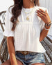 SPECYFIKACJA: Rodzaj Bluzki: Bluzka Styl: Elegancki Materiał: Bawełna, Poliester Okazja: Na co dzień Dekolt: Okrągły dekolt Wzór: Jednolity Kolor Typ rękawa: Rękaw z falbanką Długość rękawa: Krótki rękaw Typ sylwetki: Regularny Pora roku: Wiosna, Lato, Jesień Detale: Patchwork Paczka zawiera: 1 x Bluzka TABELA ROZMIARÓW (cm) Ro...