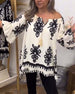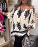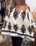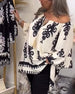 SPECYFIKACJE: Rodzaj Bluzki: Bluzki Styl: Nieformalny, Urlop, Szykowny Materiał: Bawełna z domieszką Okazja: Na co dzień, Wakacje Dekolt: Carmen Wzór: Nadruk/Wzór Sleeve Type: Rękaw z falbanką Długość rękawa: Rękaw 3/4 Typ sylwetki: Luźny krój Pora roku: Wiosna, Lato Paczka zawiera: 1 x Bluzka TABELA ROZMIARÓW (cm) Rozmiar Biust Długość S ...