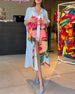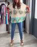 Patchworkowa bluzka z falbankami i nadrukiem z dekoltem w kształcie litery V