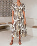 Elegancka sukienka o nieregularnym kroju z nadrukiem i dekoltem w kształcie litery V