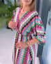 Kolorowa patchworkowa sukienka z dekoltem w kształcie litery V i rękawami trzy czwarte