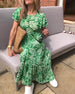 SPECYFIKACJA: Styl: Elegancki Materiał: Bawełna z domieszką Rodzaj Sukienki: Trapezowa Długość Sukienki: Maxi Dekolt: W serek Wzór: Wzór w liście Rodzaj rękawa: Bufiasty rękaw Długość rękawa: Krótki rękaw Detale: Marszczona Typ sylwetki: Regularny Pora roku: Wiosna, Lato Okazja: Na co dzień, Wakacje Paczka zawiera: 1 x Sukienka TABELA ROZM...