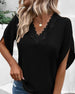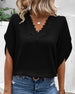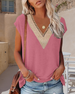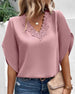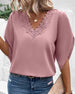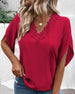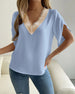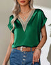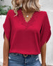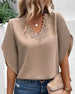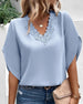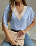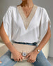SPECYFIKACJA: Rodzaj Bluzki: Bluzki Styl: Elegancki, Biznesowy Materiał: Milk Silk, Spandex, Poliester Okazja: Na co dzień, Praca Dekolt: W serek Wzór: Jednolity Kolor Typ rękawa: Rękaw rozkloszowany Długość rękawa: Krótki rękaw Typ sylwetki: Regularny Pora roku: Wiosna, Lato, Jesień Detale: Patchwork, Koronka Paczka zawiera: 1 x Bluzka TAB...