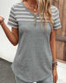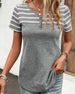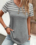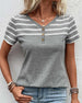 SPECYFIKACJA: Rodzaj Bluzki: Koszulka Styl: Nieformalny Materiał: Bawełna z domieszką Okazja: Na co dzień Dekolt: W serek Wzór: W paski Typ rękawa: Rękaw standardowy Długość rękawa: Krótki rękaw Typ sylwetki: Regularny Pora roku: Wiosna, Lato, Jesień Detale: Guziki Paczka zawiera: 1 x Koszulka TABELA ROZMIARÓW (cm) Rozmiar Biust ...