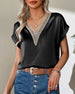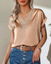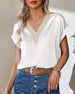 SPECYFIKACJA: Rodzaj Bluzki: Bluzki Styl: Elegancki, Biznesowy Materiał: Spandex, Satyna Okazja: Na co dzień, Praca Dekolt: W serek Wzór: Jednolity Kolor Typ rękawa: Rękaw standardowy Długość rękawa: Krótki rękaw Typ sylwetki: Luźny krój Pora roku: Wiosna, Lato, Jesień Detale: Patchwork, Koronka Paczka zawiera: 1 x Bluzka TABELA ROZMIARÓW (...